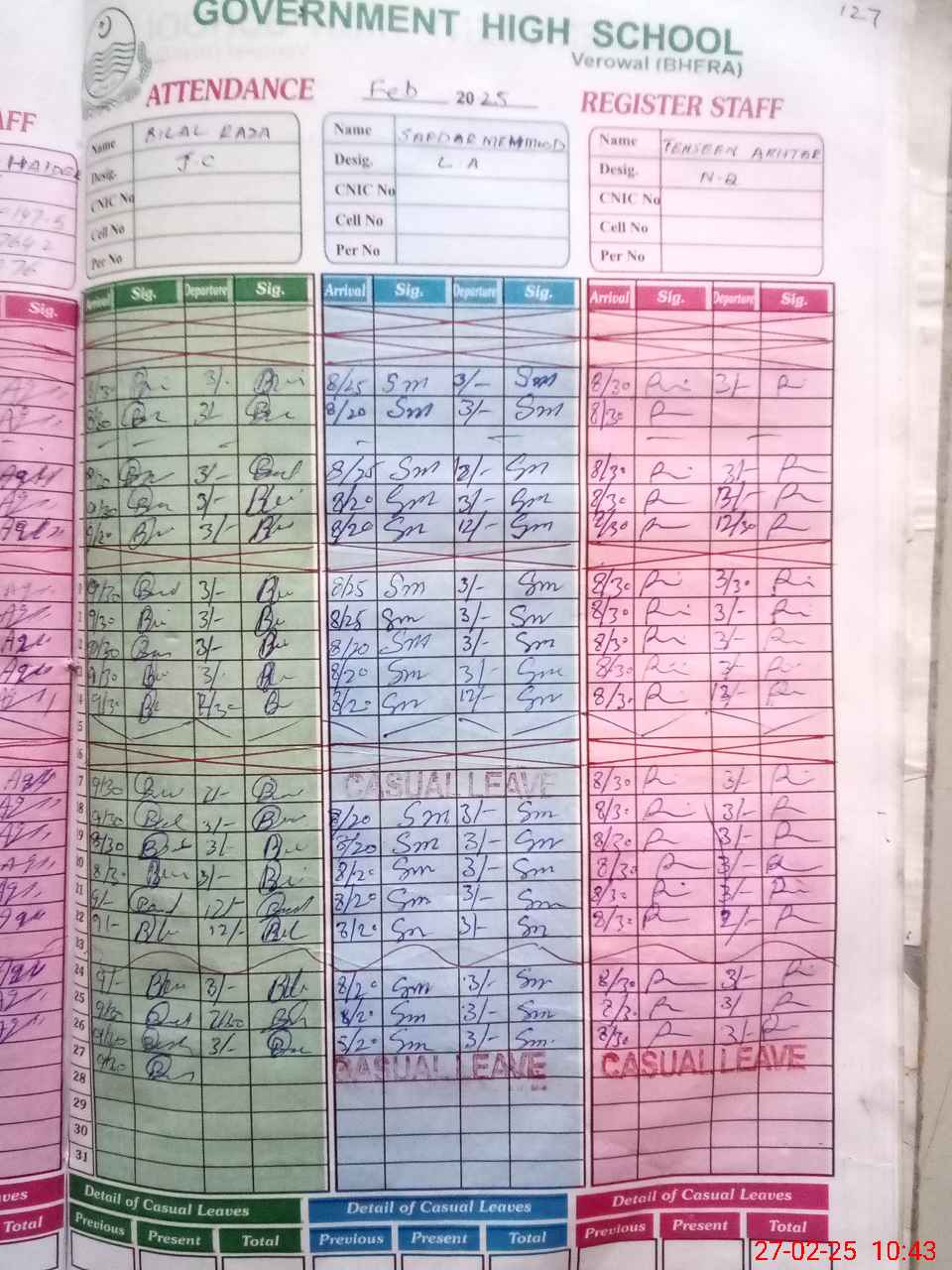| CNIC | Full Name | Designation | R/C | Absence during last cal. month |