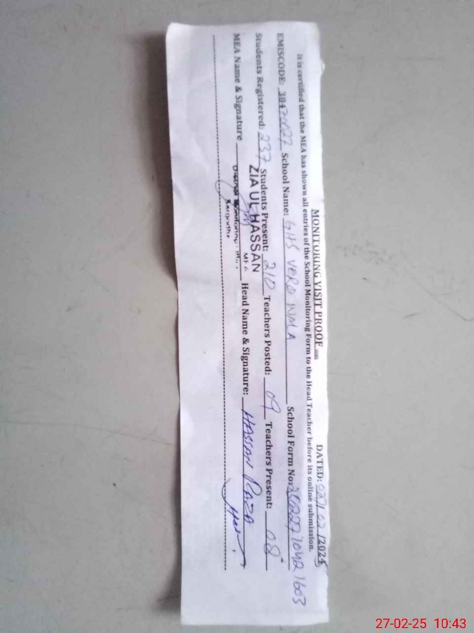 | EMIS Code: 38470027 | Name of School: GHS VERO WALA | |||