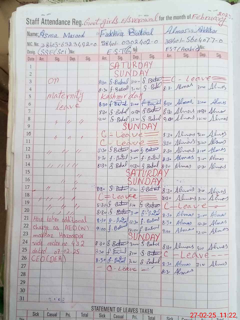 | CNIC | Full Name | Designation | R/C | Absence During Last Calender Month |