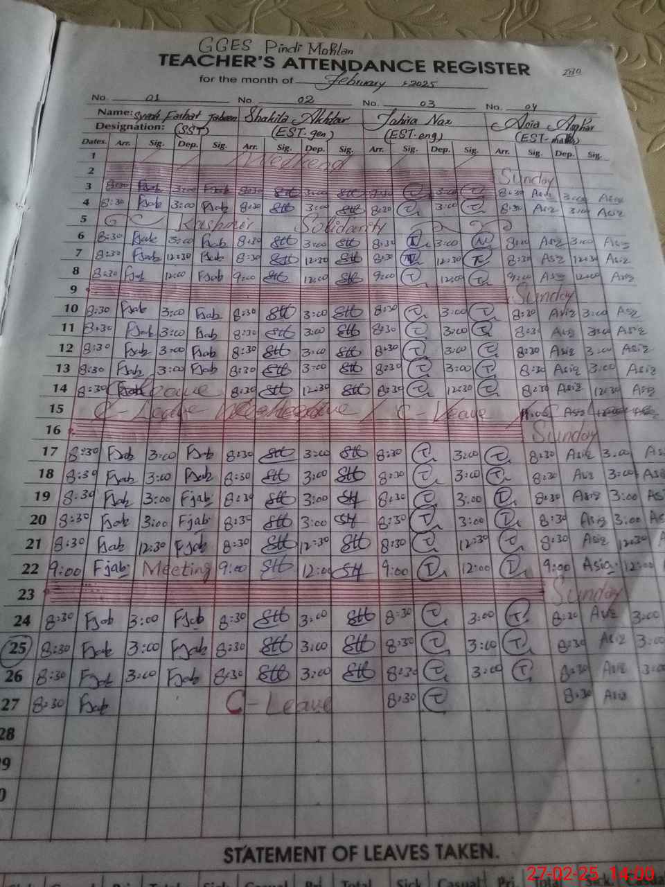 | CNIC | Full Name | Designation | R/C | Absence During Last Calender Month |