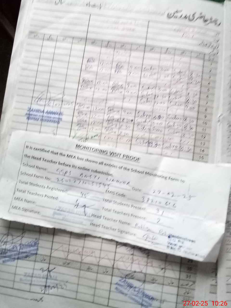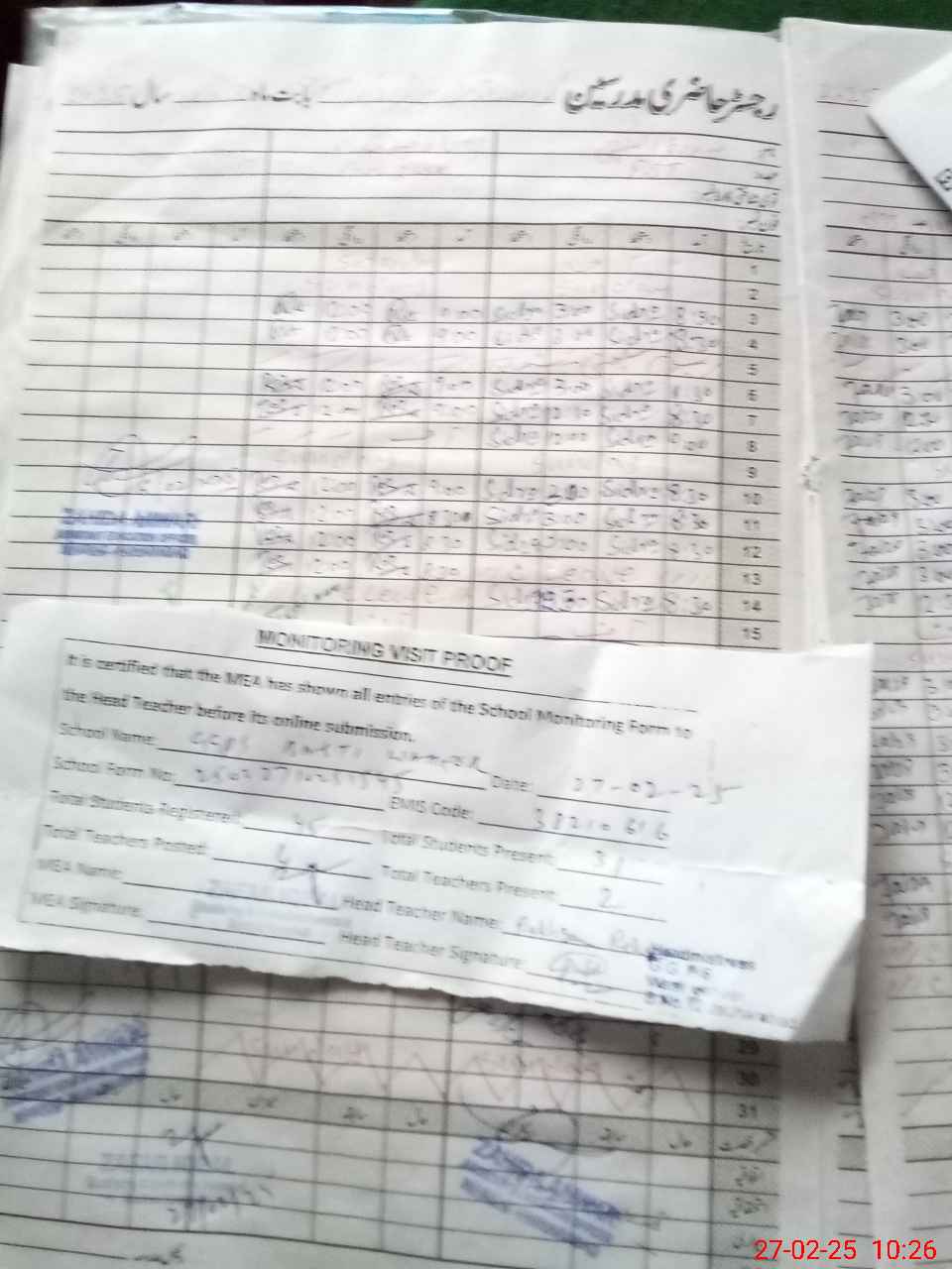 | Attendance Register | Head Teacher | MEA with School | Visit Proof |