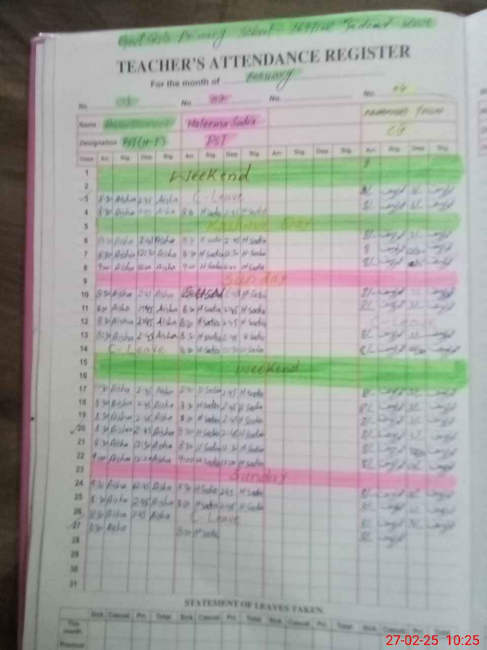 | Leave | Duty | Absent | Maternity | Medical | Ex- Pak |