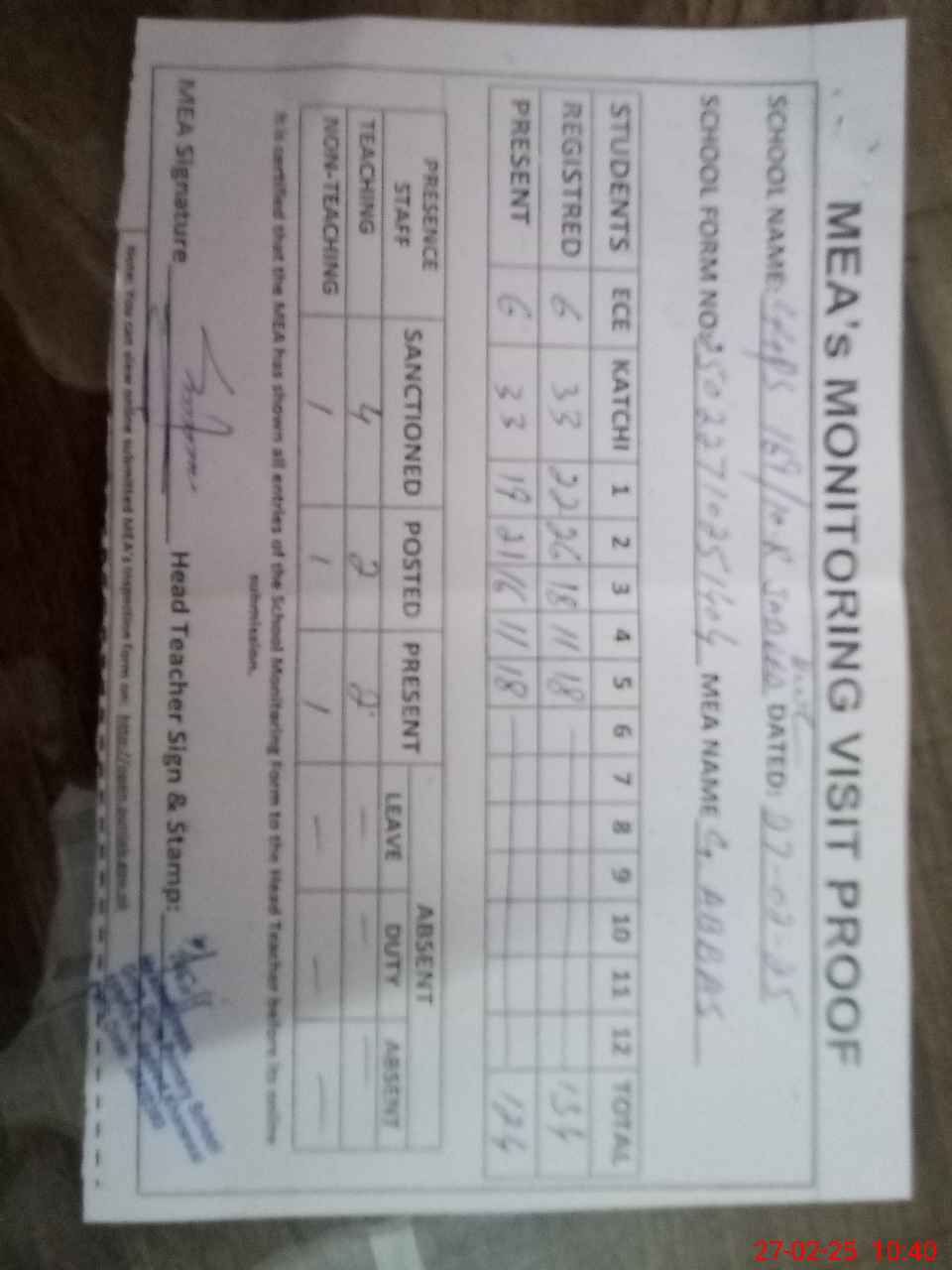 | Attendance Register | Head Teacher | MEA with School | Visit Proof |