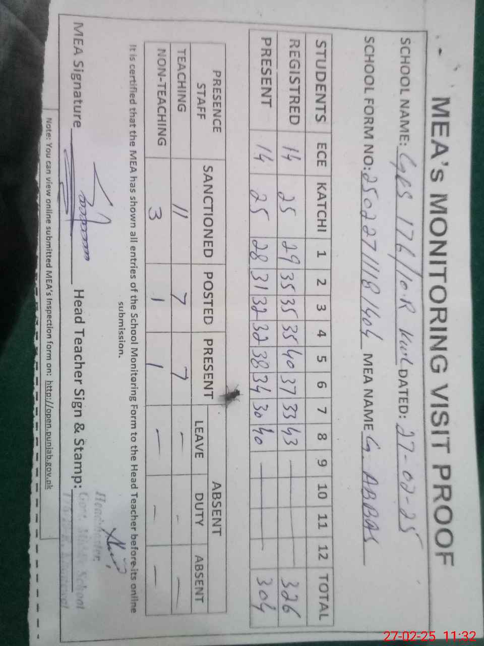 | Attendance Register | Head Teacher | MEA with School | Visit Proof |