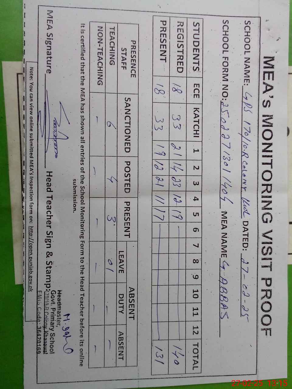 | EMIS Code: 36420169 | Name of School: GPS 170/10-R, KHANEWAL | |||