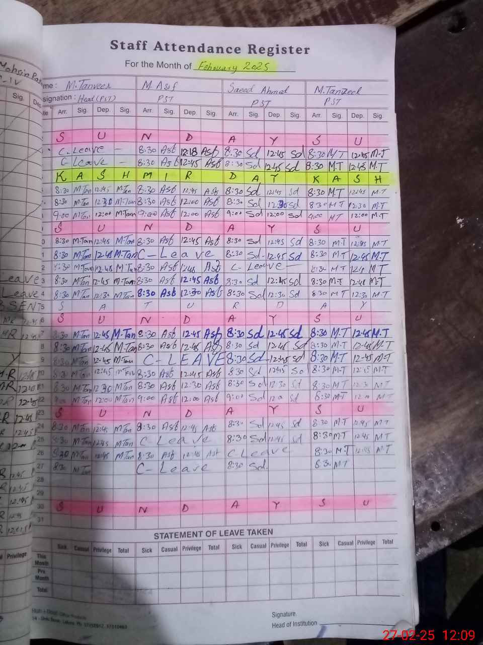 | CNIC | Full Name | Designation | R/C | Absence During Last Calender Month |