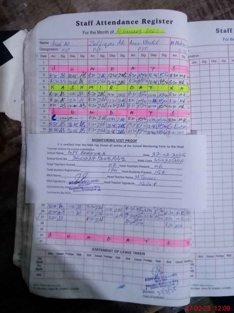 | Attendance Register | Head Teacher | MEA with School | Visit Proof |