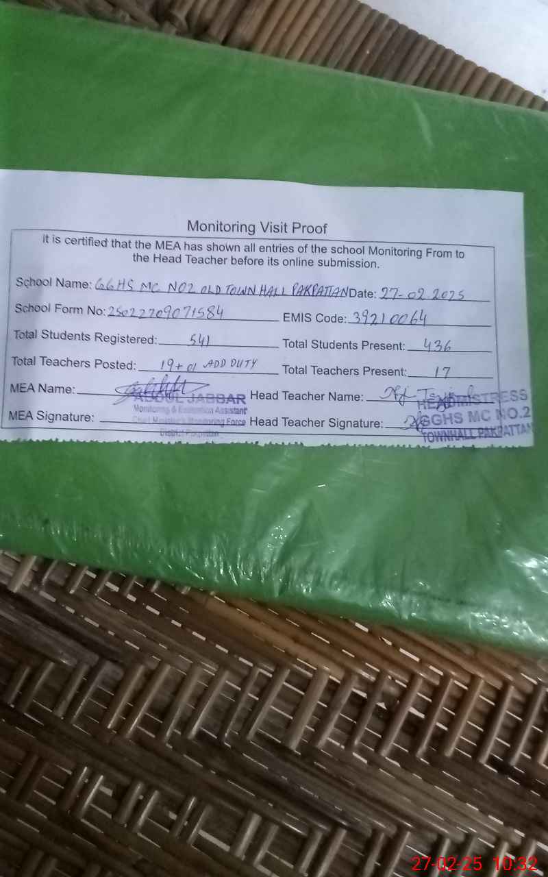 | EMIS Code: 39210064 | Name of School: GGHS MC NO. 2 OLD TOWN HALL PAKPATTAN | |||
