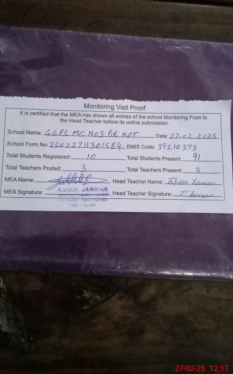| EMIS Code: 39210373 | Name of School: GGPS MC NO. 3 PIR KOT PAKPATTAN | |||
