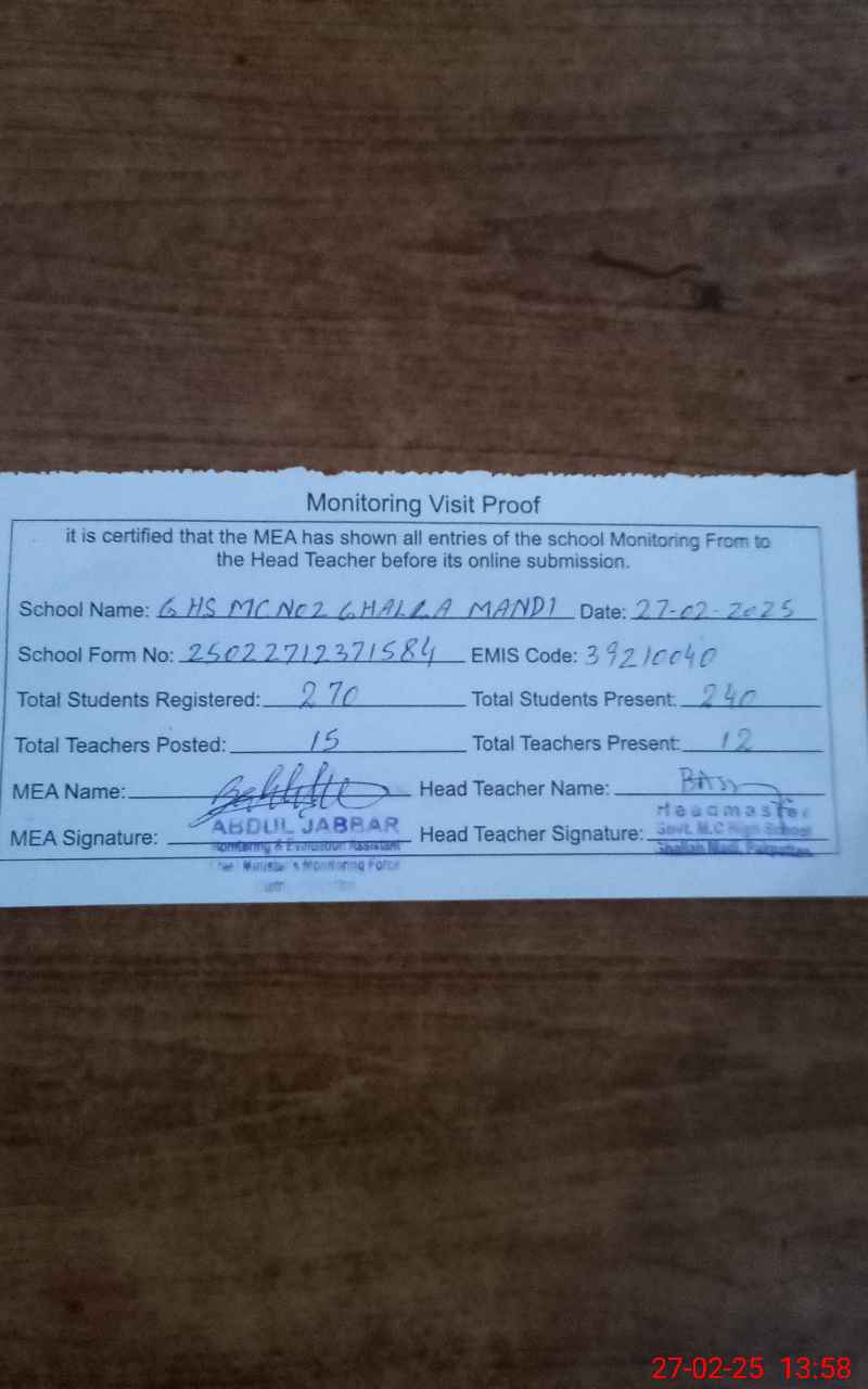 | EMIS Code: 39210040 | Name of School: GHS MC NO. 2 GHALLA MANDI | |||
