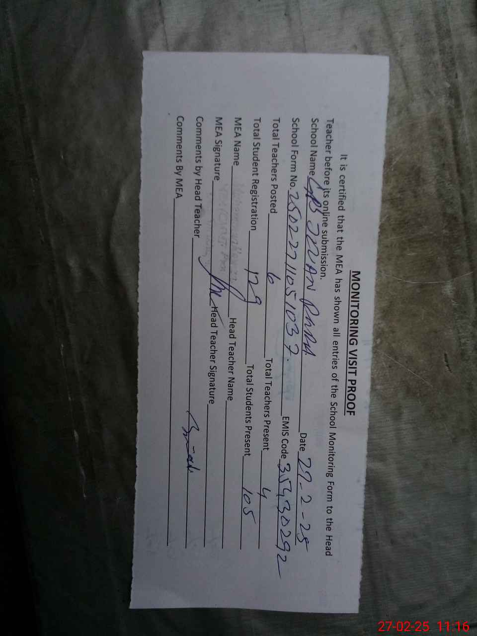| Attendance Register | Head Teacher | MEA with School | Visit Proof |