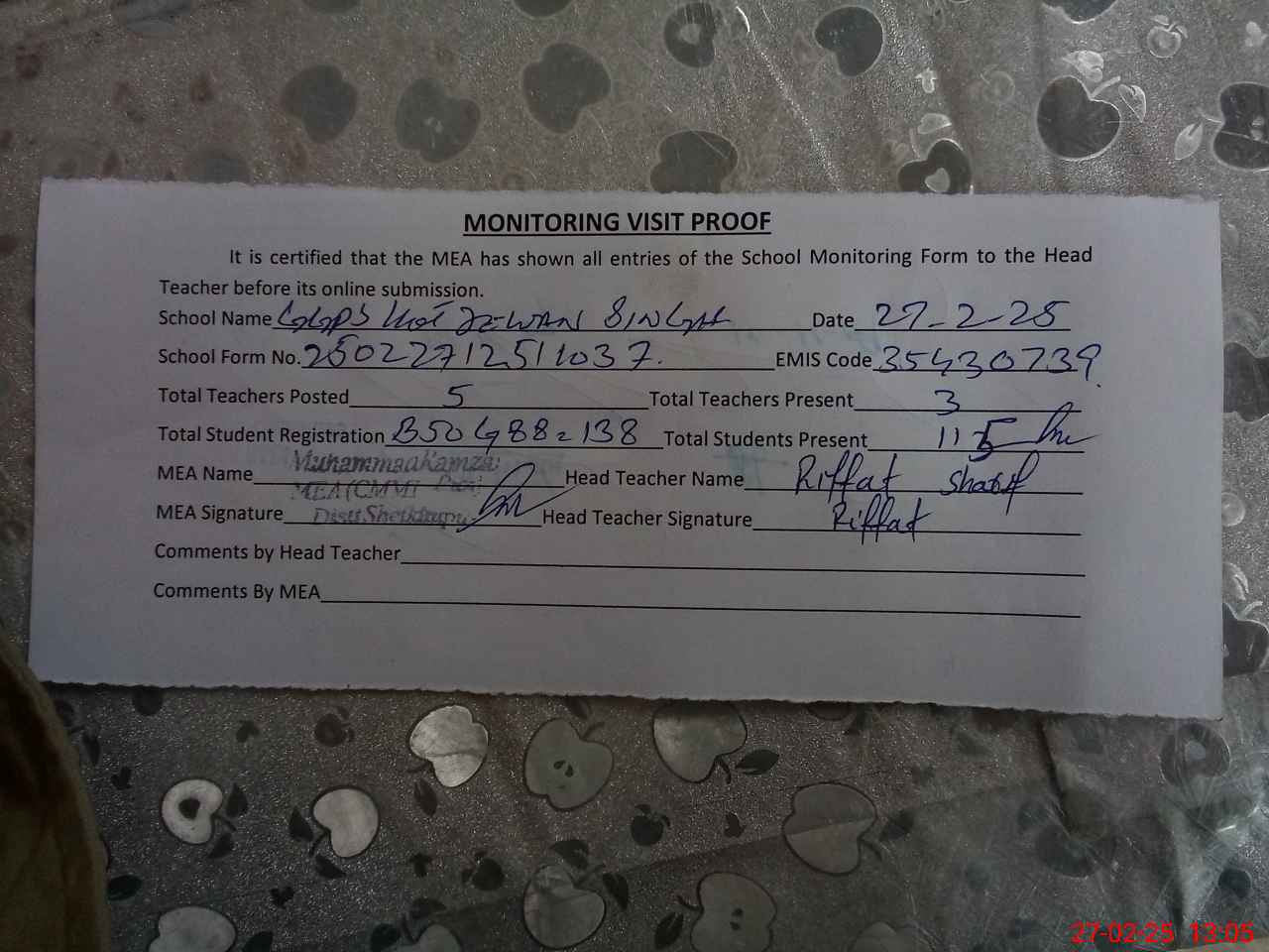 | Attendance Register | Head Teacher | MEA with School | Visit Proof |