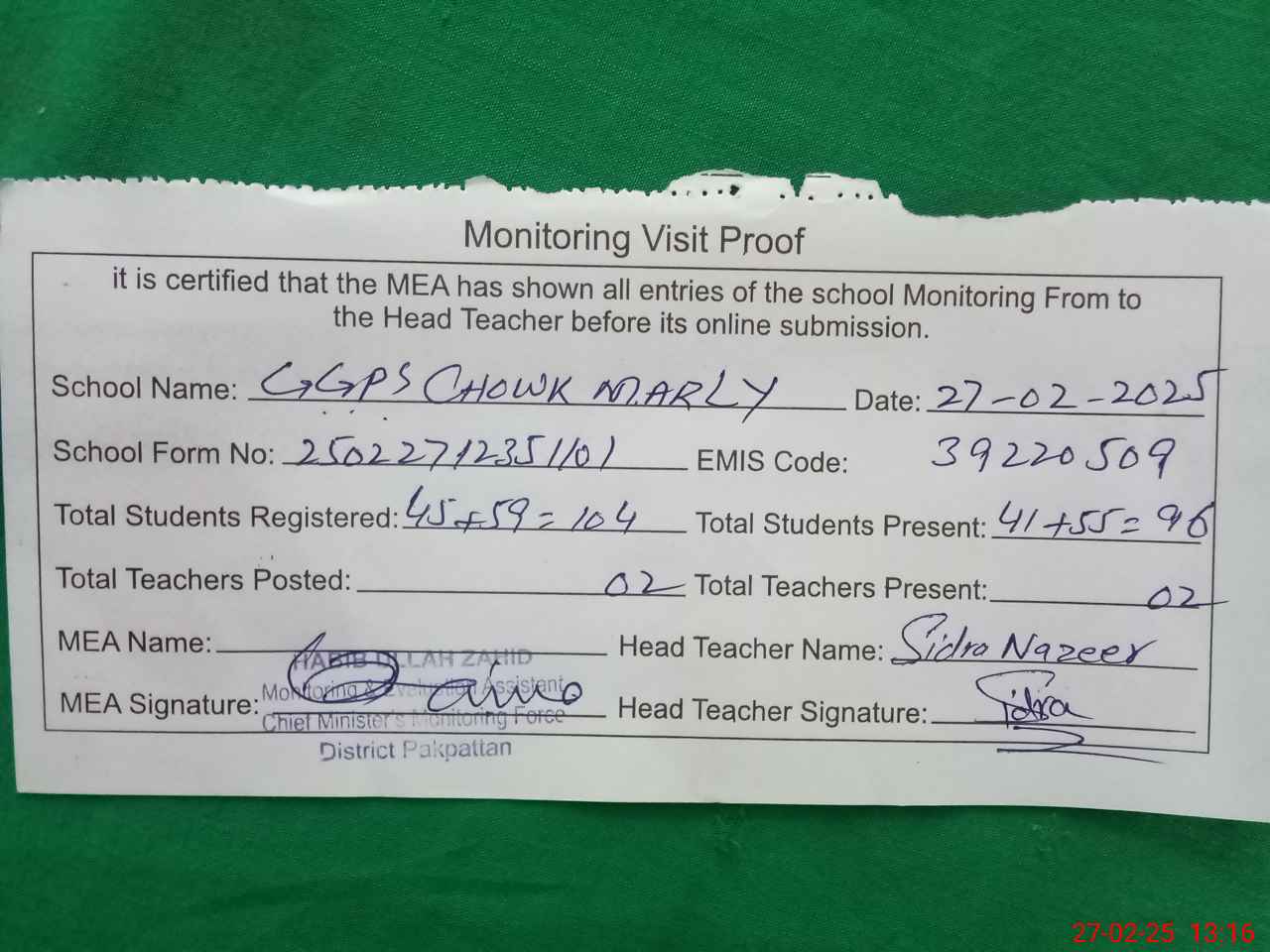 | Attendance Register | Head Teacher | MEA with School | Visit Proof |