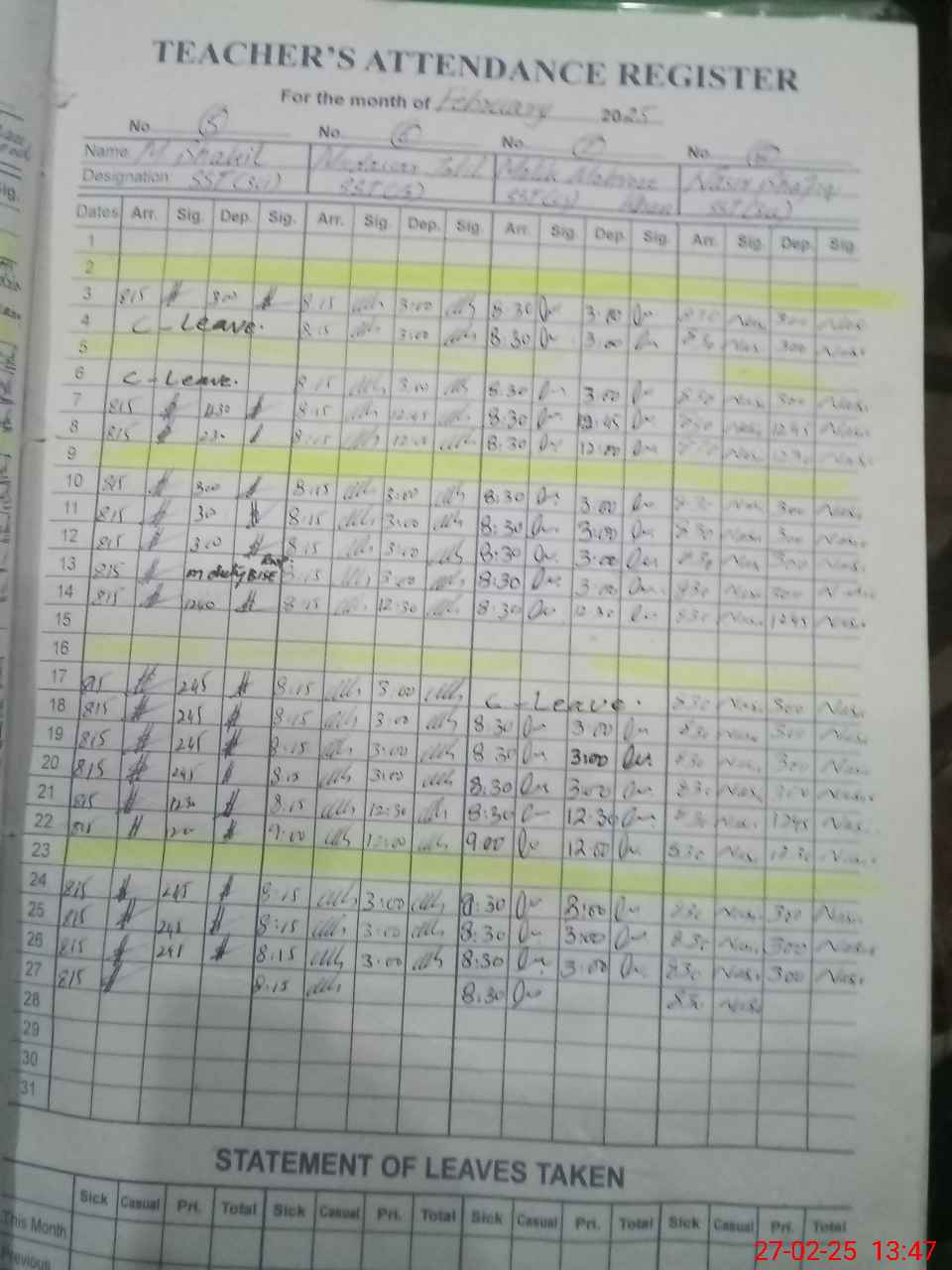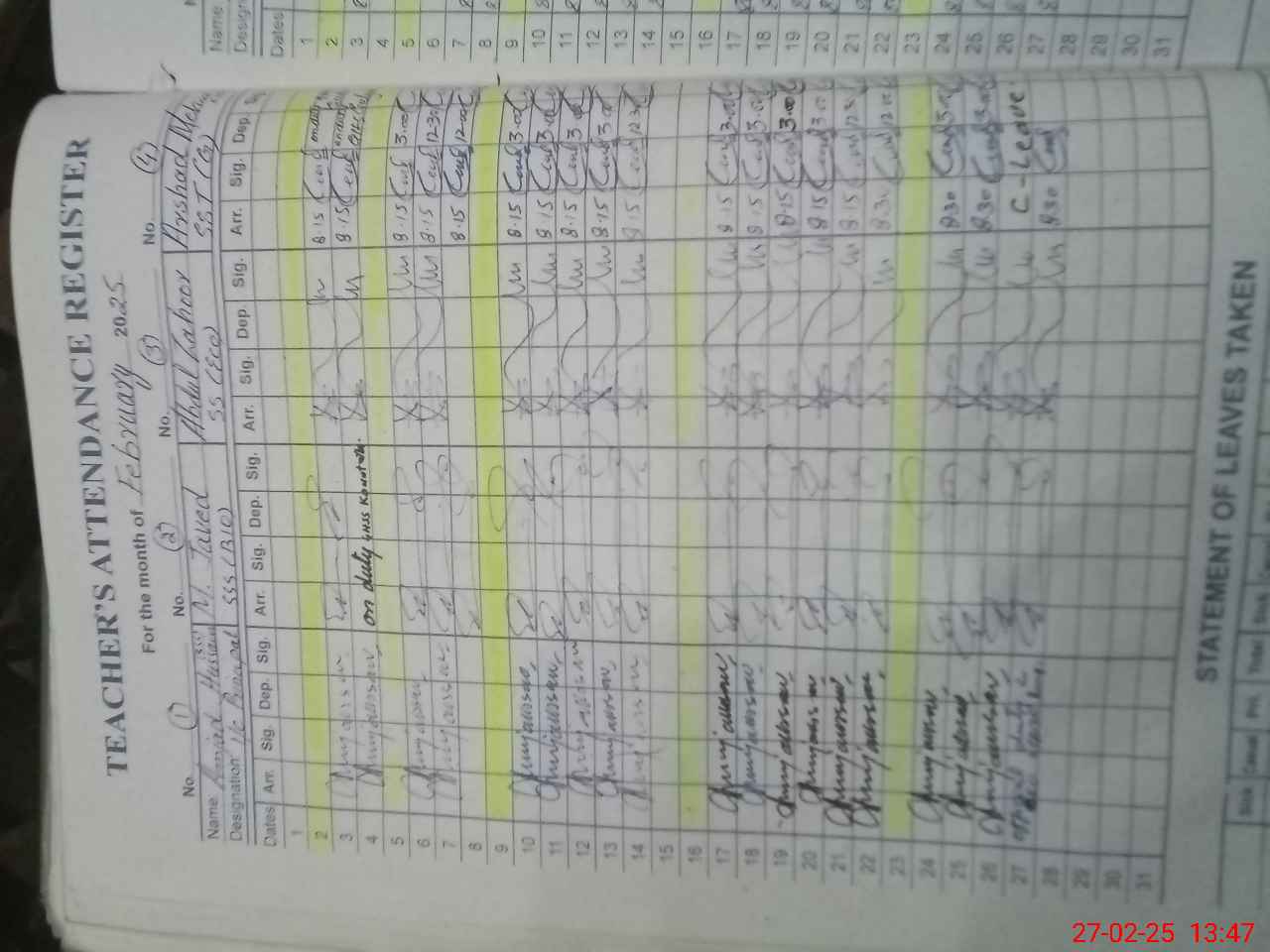 | CNIC | Full Name | Designation | R/C | Absence During Last Calender Month |