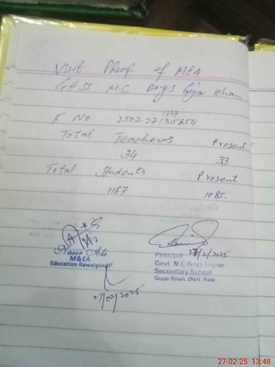 | Attendance Register | Head Teacher | MEA with School | Visit Proof |