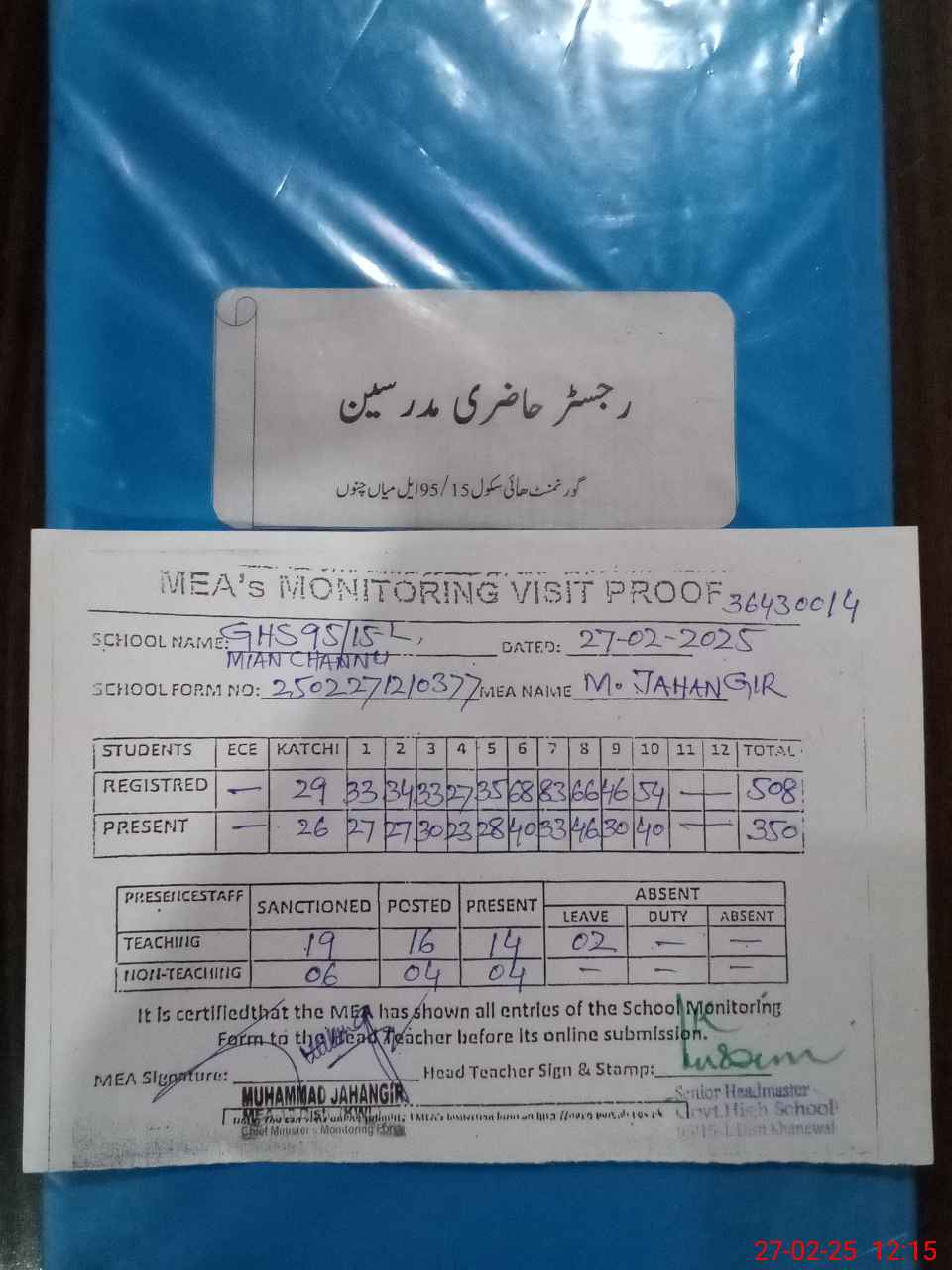 | Attendance Register | Head Teacher | MEA with School | Visit Proof |