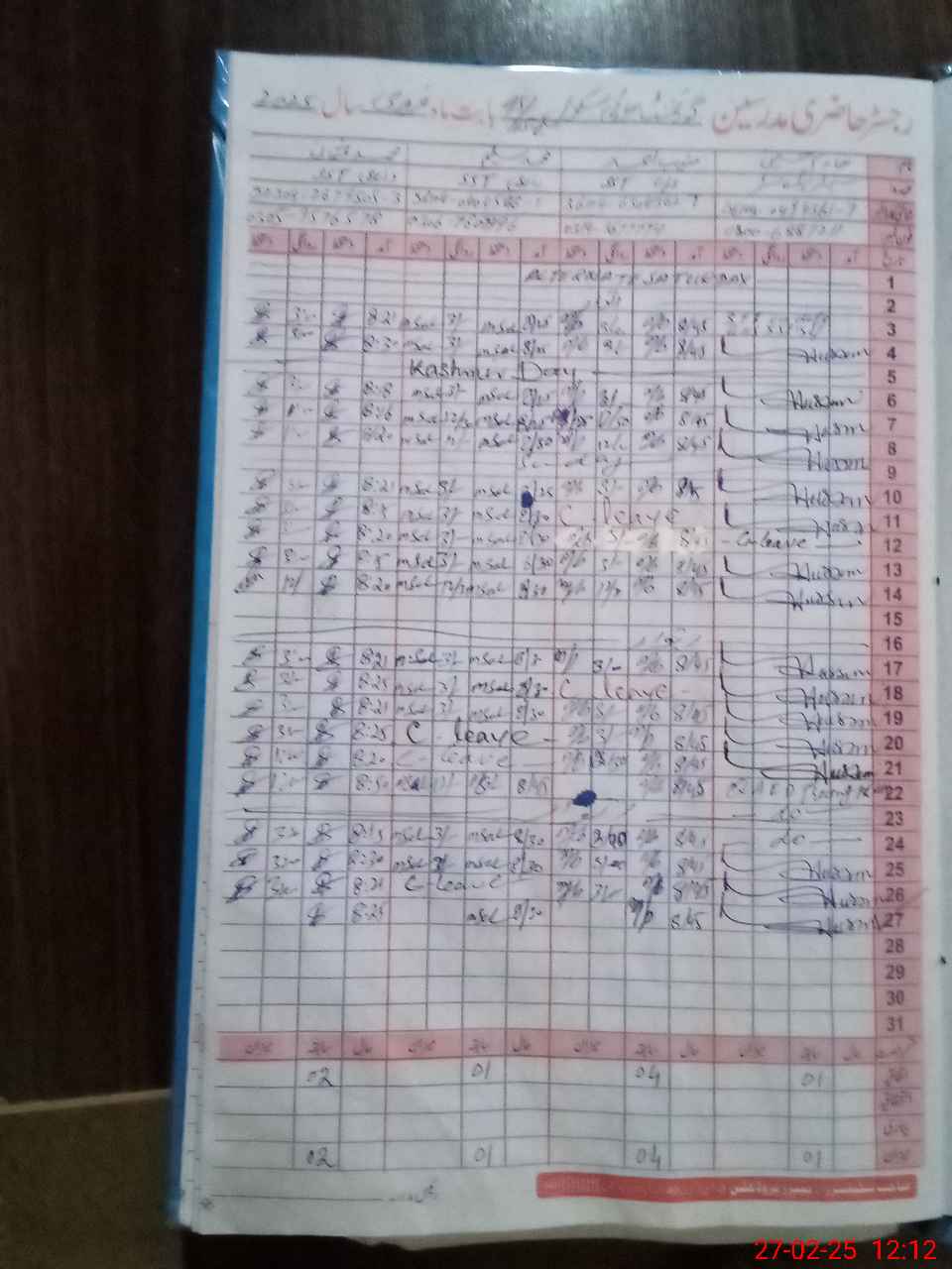 | CNIC | Full Name | Designation | R/C | Absence During Last Calender Month |