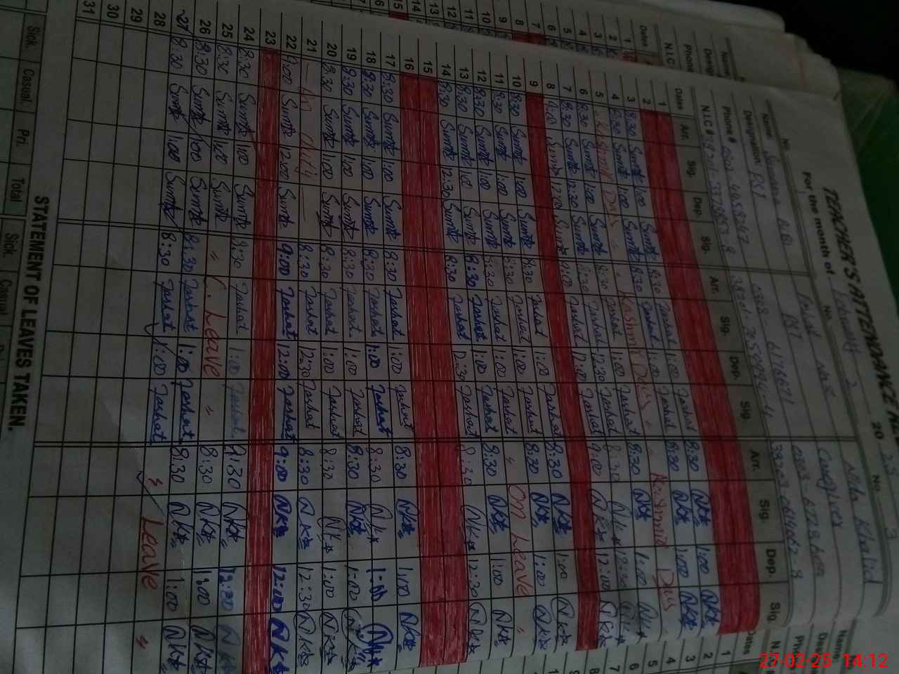 | CNIC | Full Name | Designation | R/C | Absence During Last Calender Month |