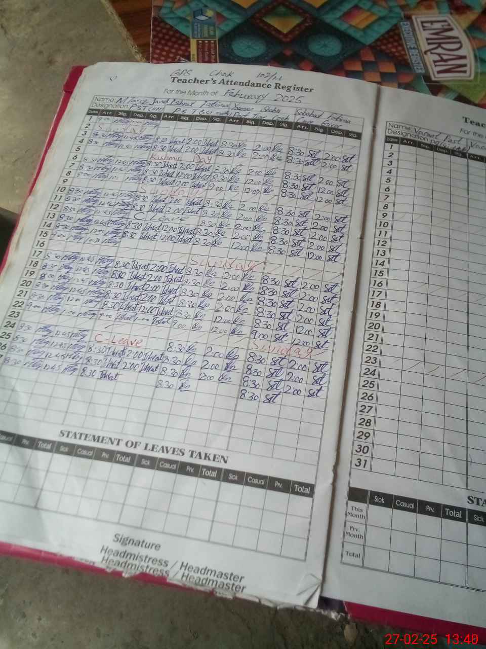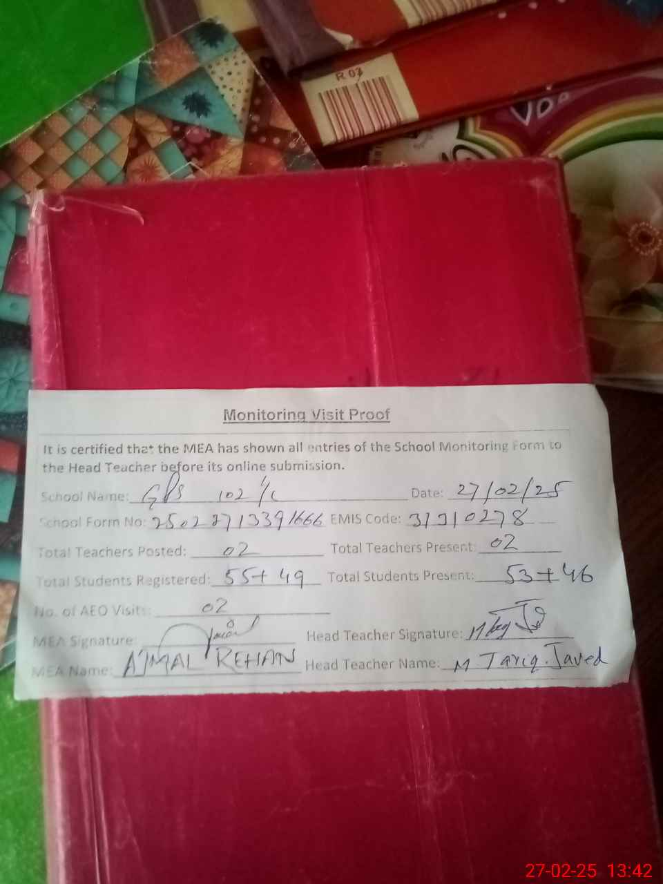 | Attendance Register | Head Teacher | MEA with School | Visit Proof |