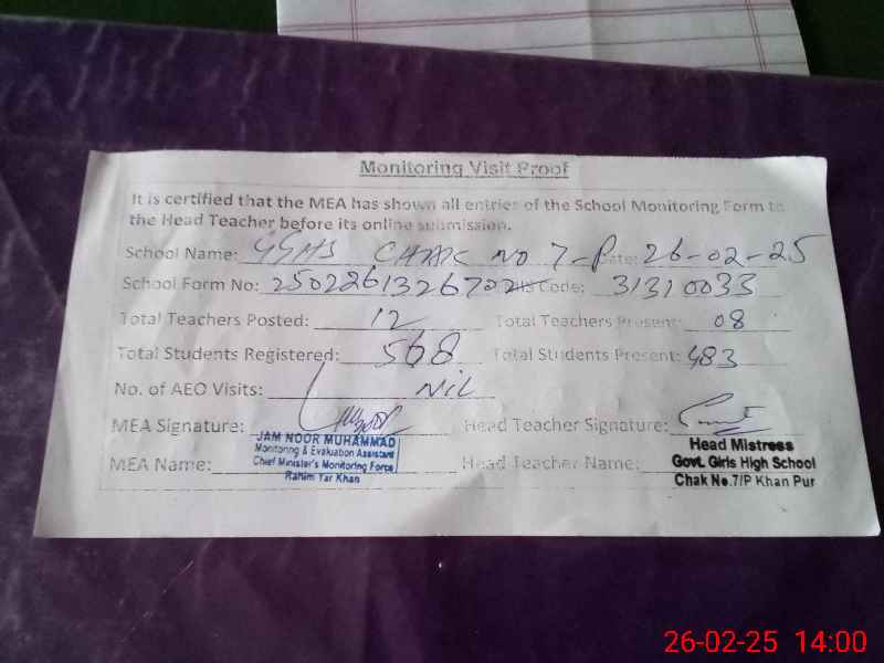 | EMIS Code: 31310033 | Name of School: GGHS CHAK NO. 7/P | |||