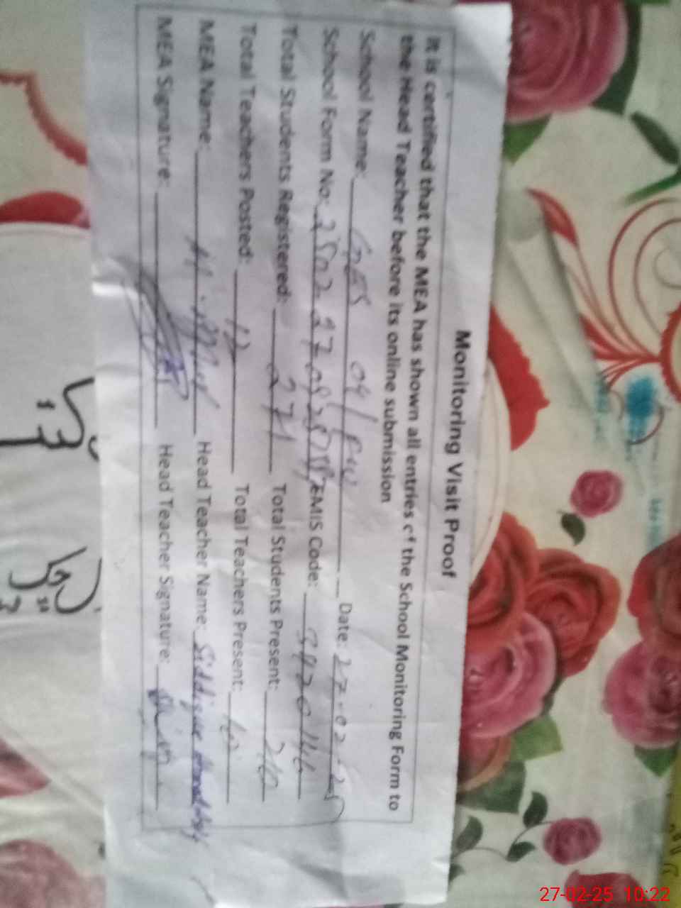 | Attendance Register | Head Teacher | MEA with School | Visit Proof |