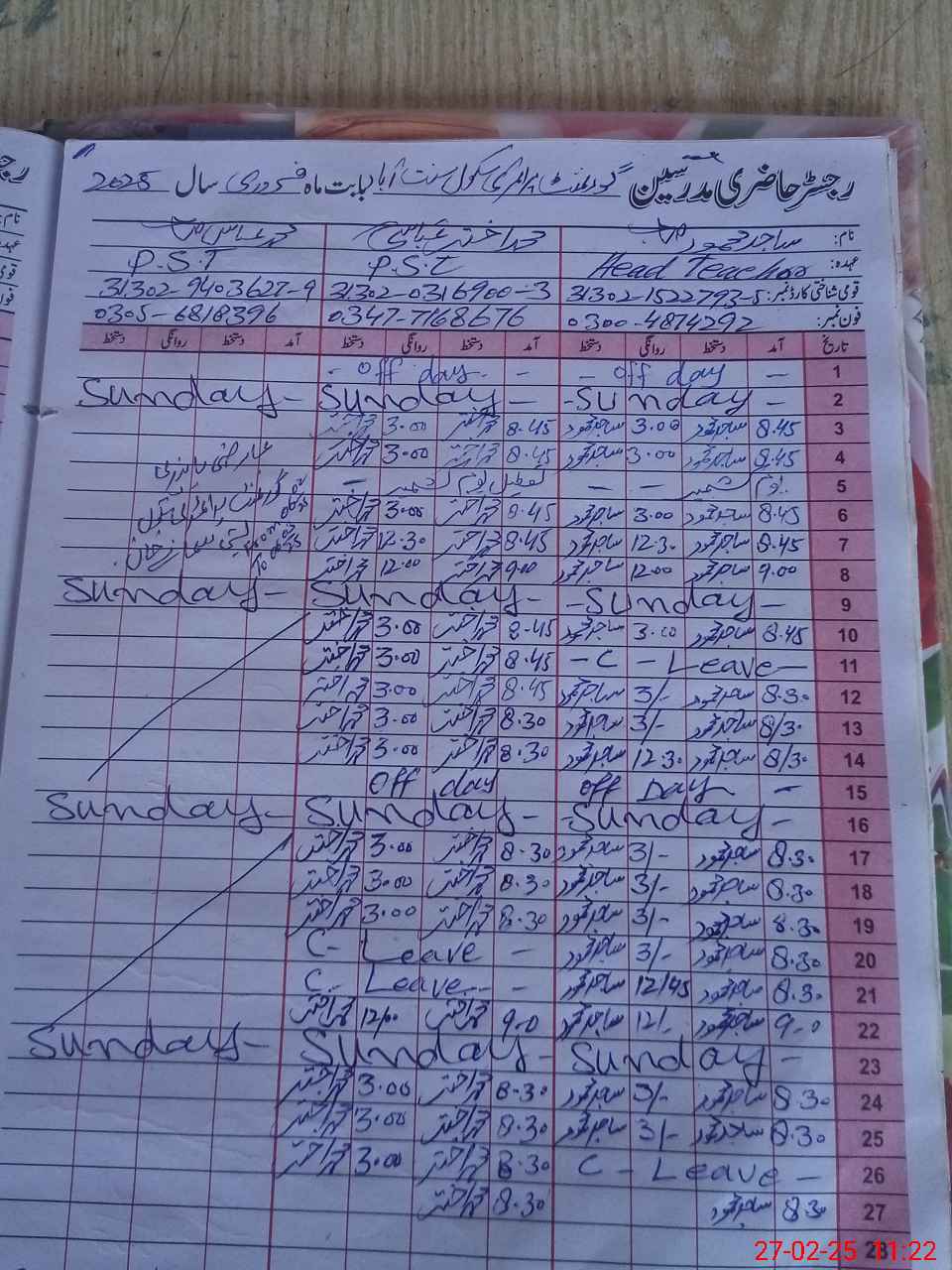 | CNIC | Full Name | Designation | R/C | Absence During Last Calender Month |