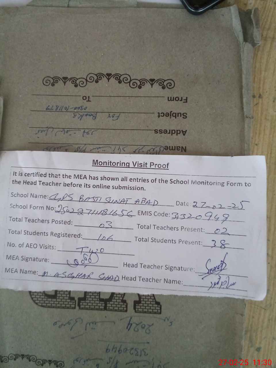 | Attendance Register | Head Teacher | MEA with School | Visit Proof |