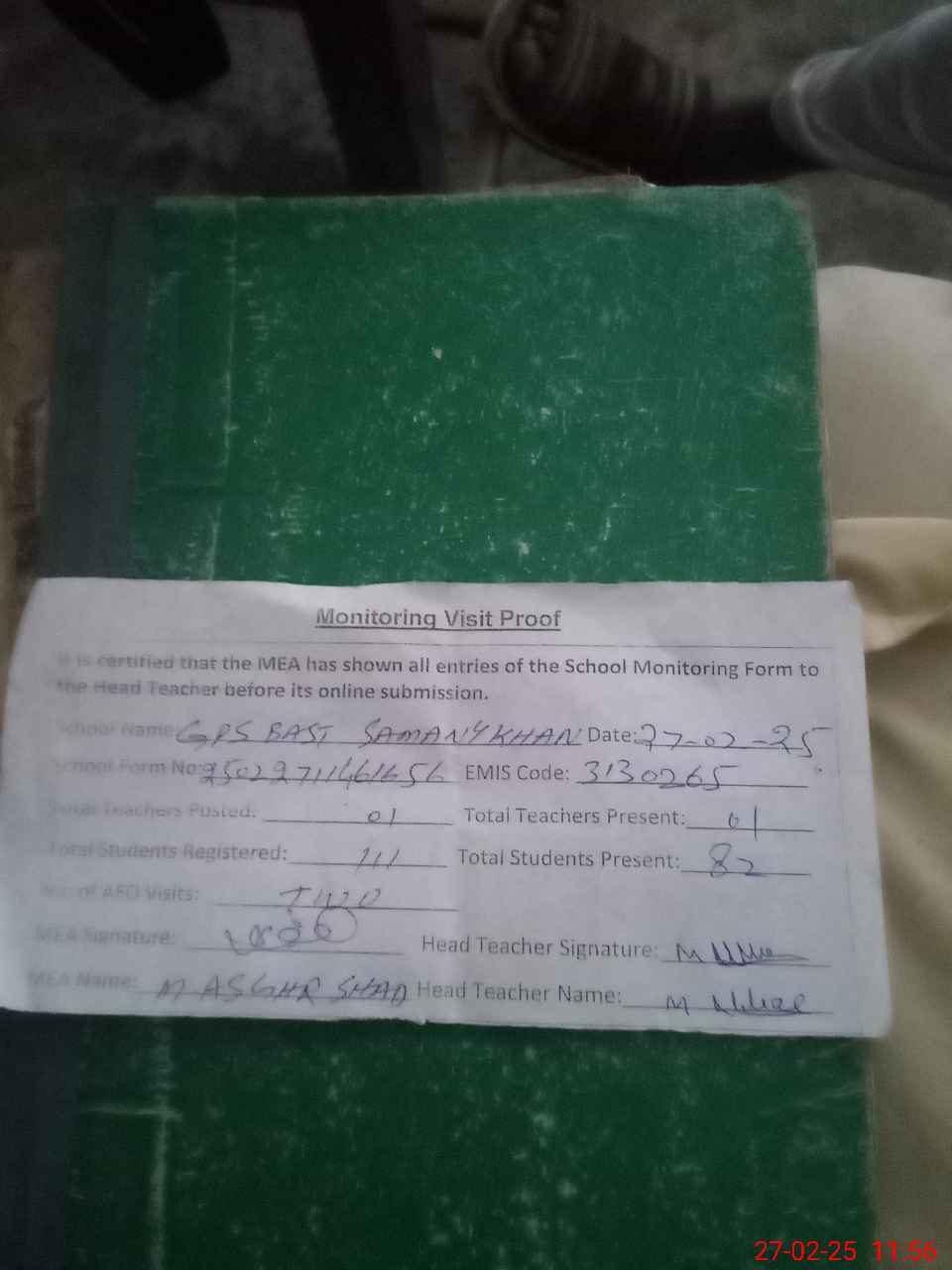 | Attendance Register | Head Teacher | MEA with School | Visit Proof |