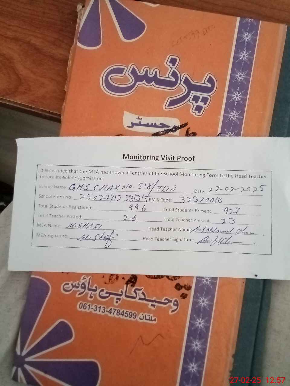 | EMIS Code: 32320010 | Name of School: GHS CHAK NO.518 TDA | |||