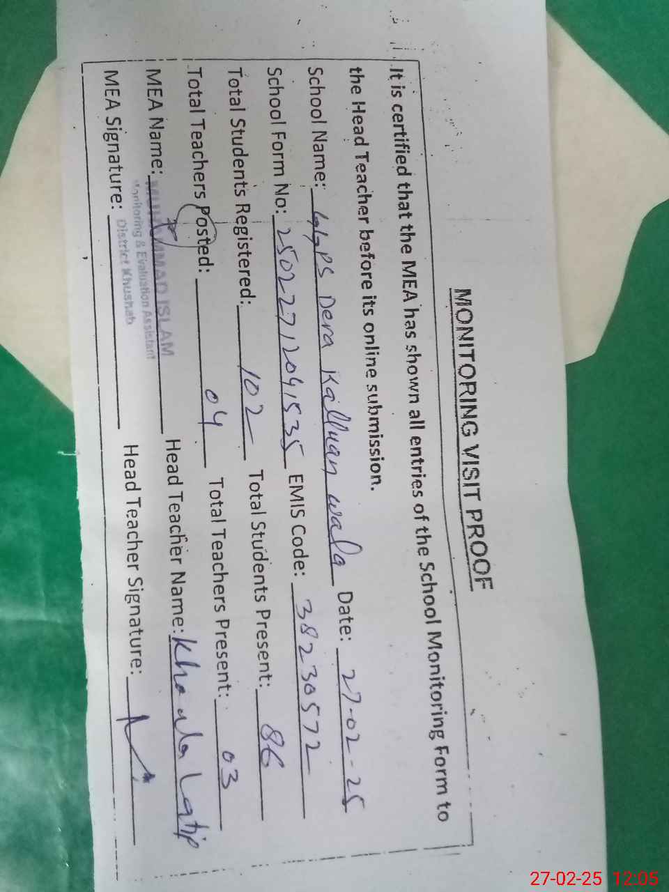 | Attendance Register | Head Teacher | MEA with School | Visit Proof |