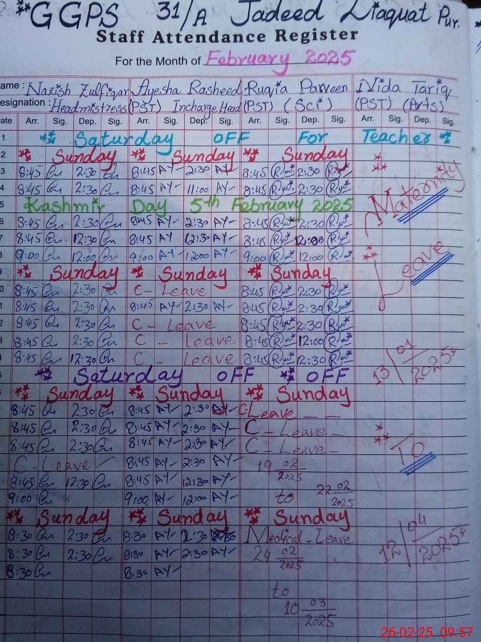 | Leave | Duty | Absent | Maternity | Medical | Ex- Pak |