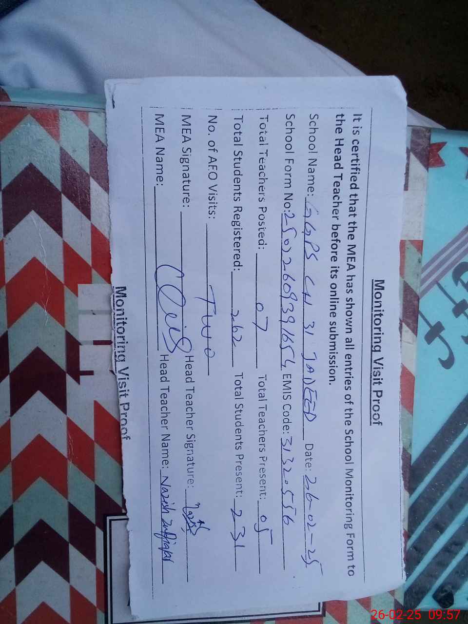 | Attendance Register | Head Teacher | MEA with School | Visit Proof |