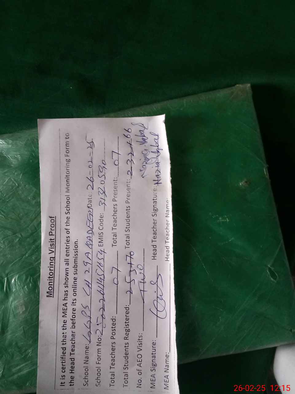 | Attendance Register | Head Teacher | MEA with School | Visit Proof |