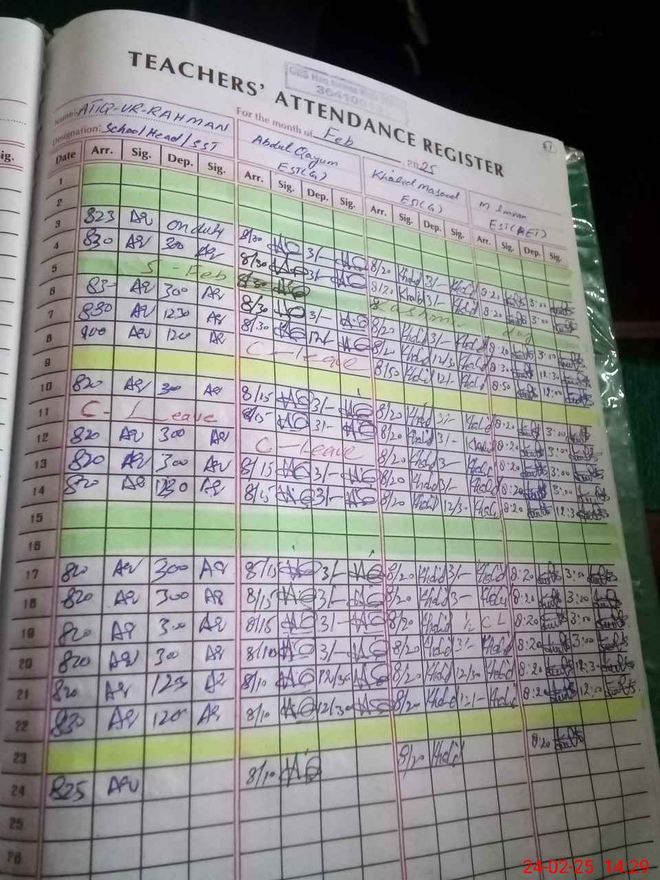 | CNIC | Full Name | Designation | R/C | Absence During Last Calender Month |