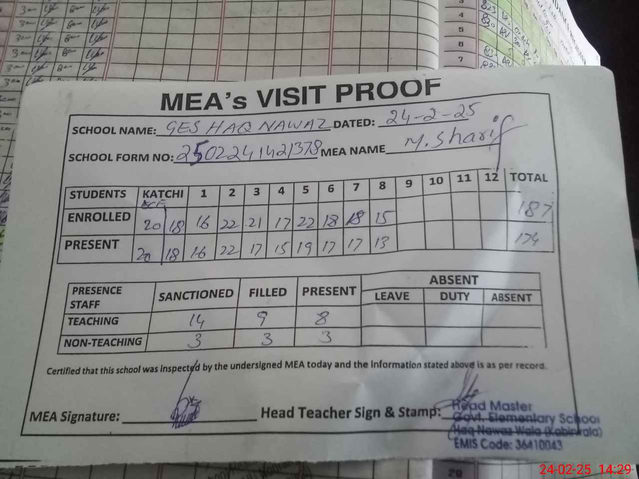 | Attendance Register | Head Teacher | MEA with School | Visit Proof |