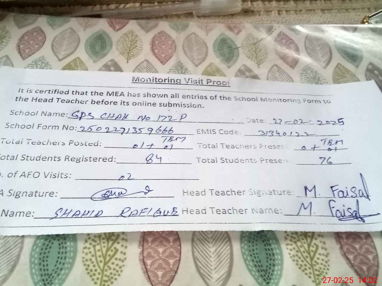 | EMIS Code: 31340122 | Name of School: GPS CHAK NO 172/P | |||