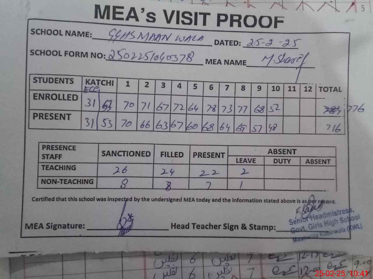 | Certified that this School was Inspected by the Undersigned MEA/DMO Today and the Information Stated Above is as Per Record. | |||||