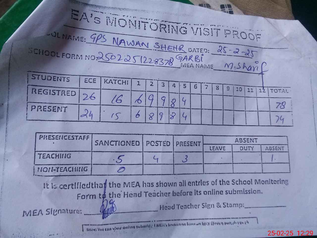 | Attendance Register | Head Teacher | MEA with School | Visit Proof |