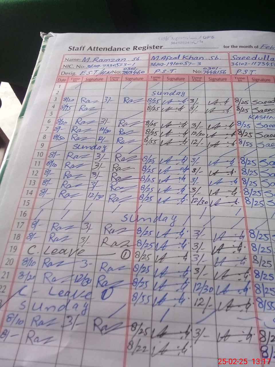 | CNIC | Full Name | Designation | R/C | Absence during last cal. month |