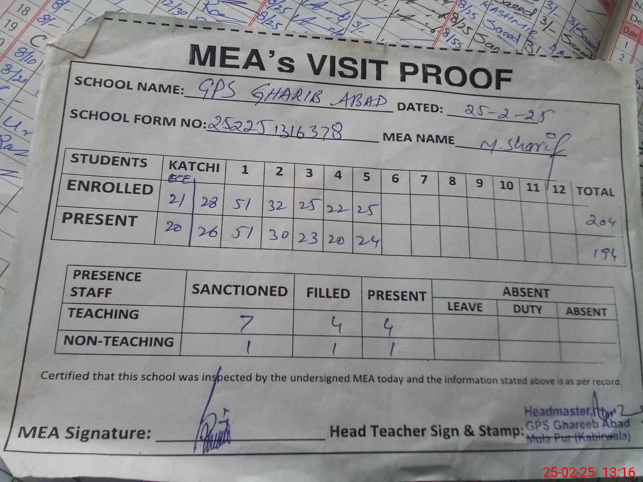 | Attendance Register | Head Teacher | MEA with School | Visit Proof |