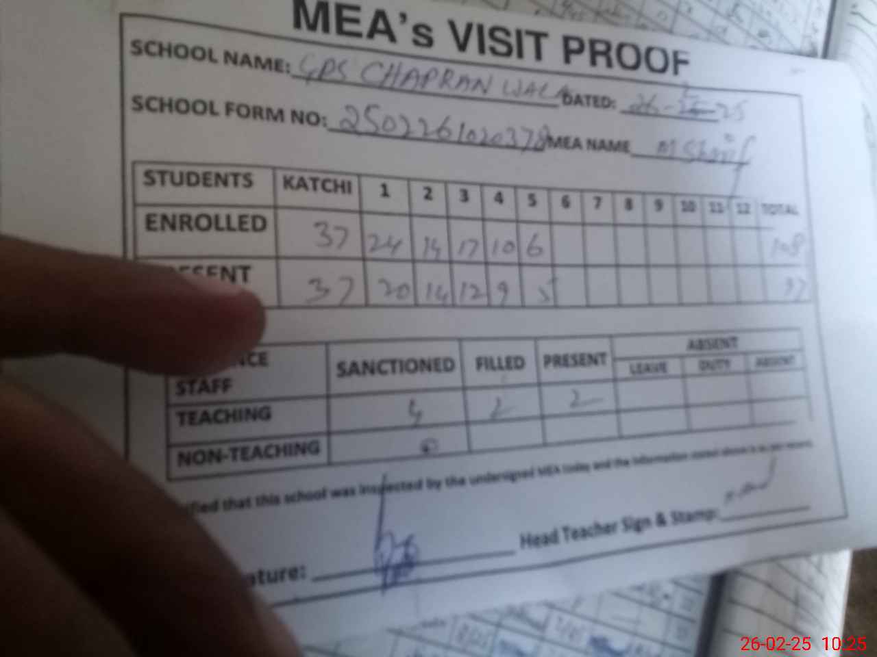 | Attendance Register | Head Teacher | MEA with School | Visit Proof |