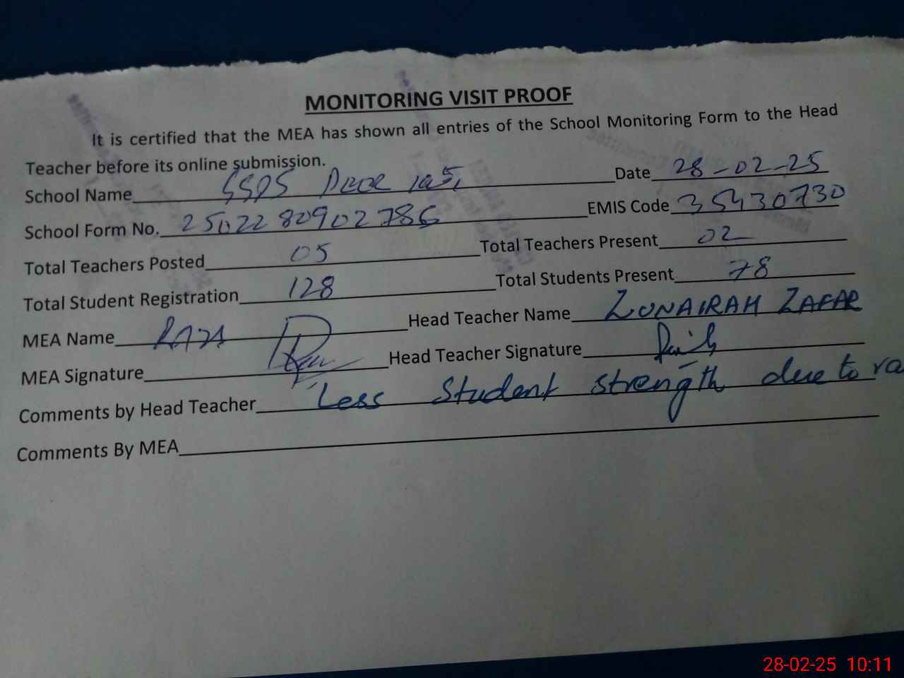 | Attendance Register | Head Teacher | MEA with School | Visit Proof |