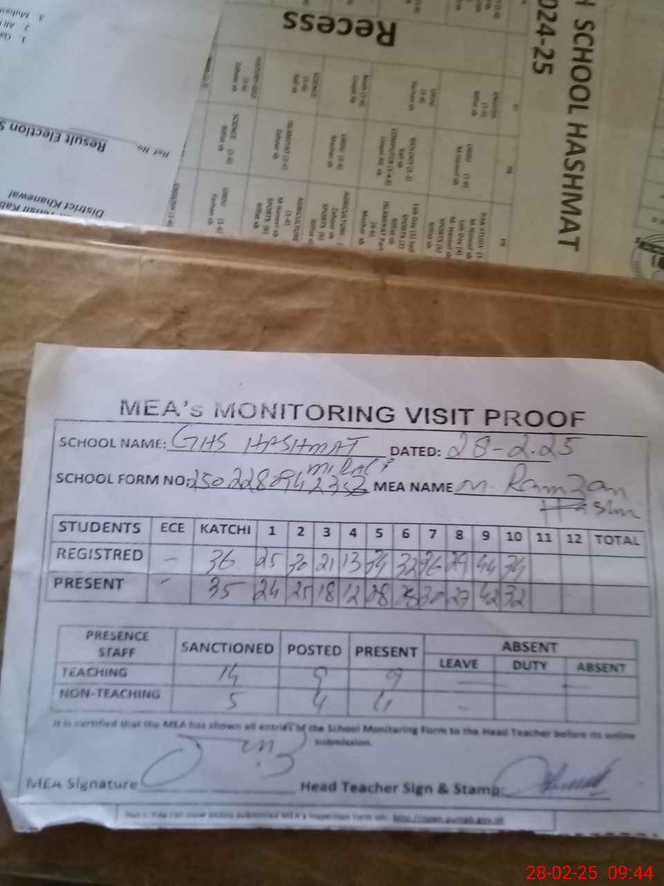 | Attendance Register | Head Teacher | MEA with School | Visit Proof |