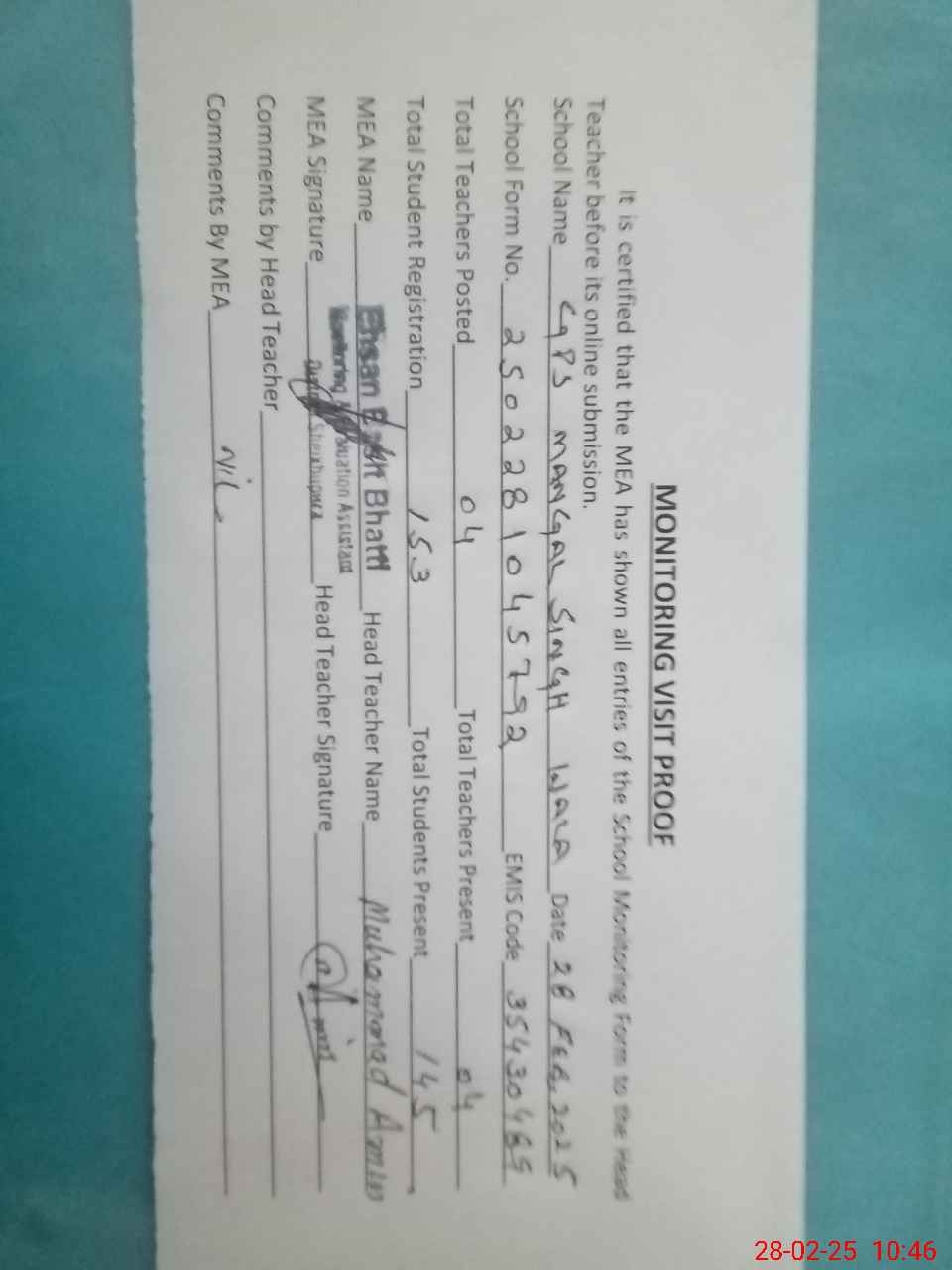 | Attendance Register | Head Teacher | MEA with School | Visit Proof |