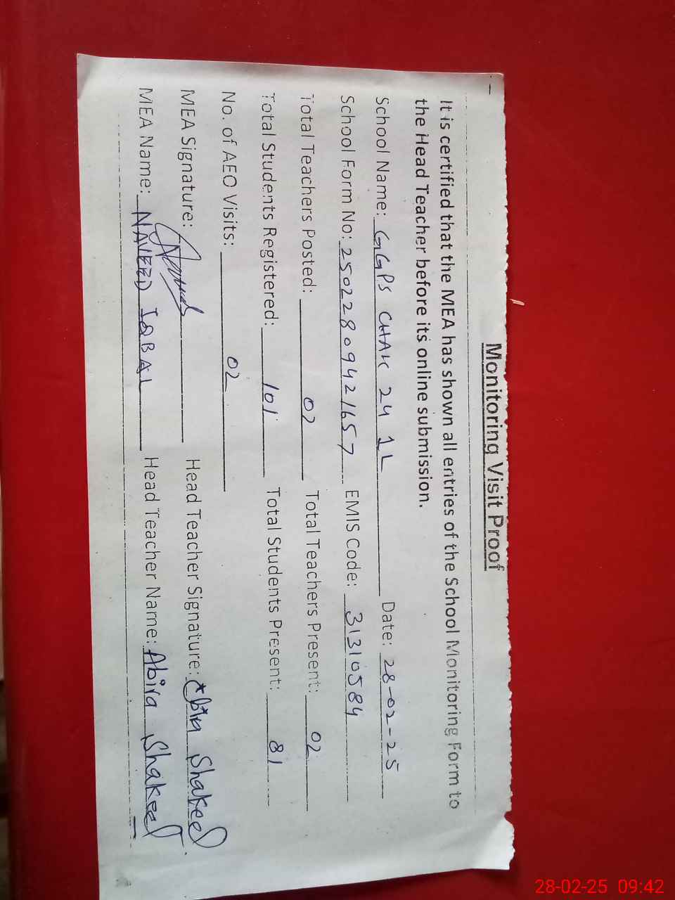 | Attendance Register | Head Teacher | MEA with School | Visit Proof |