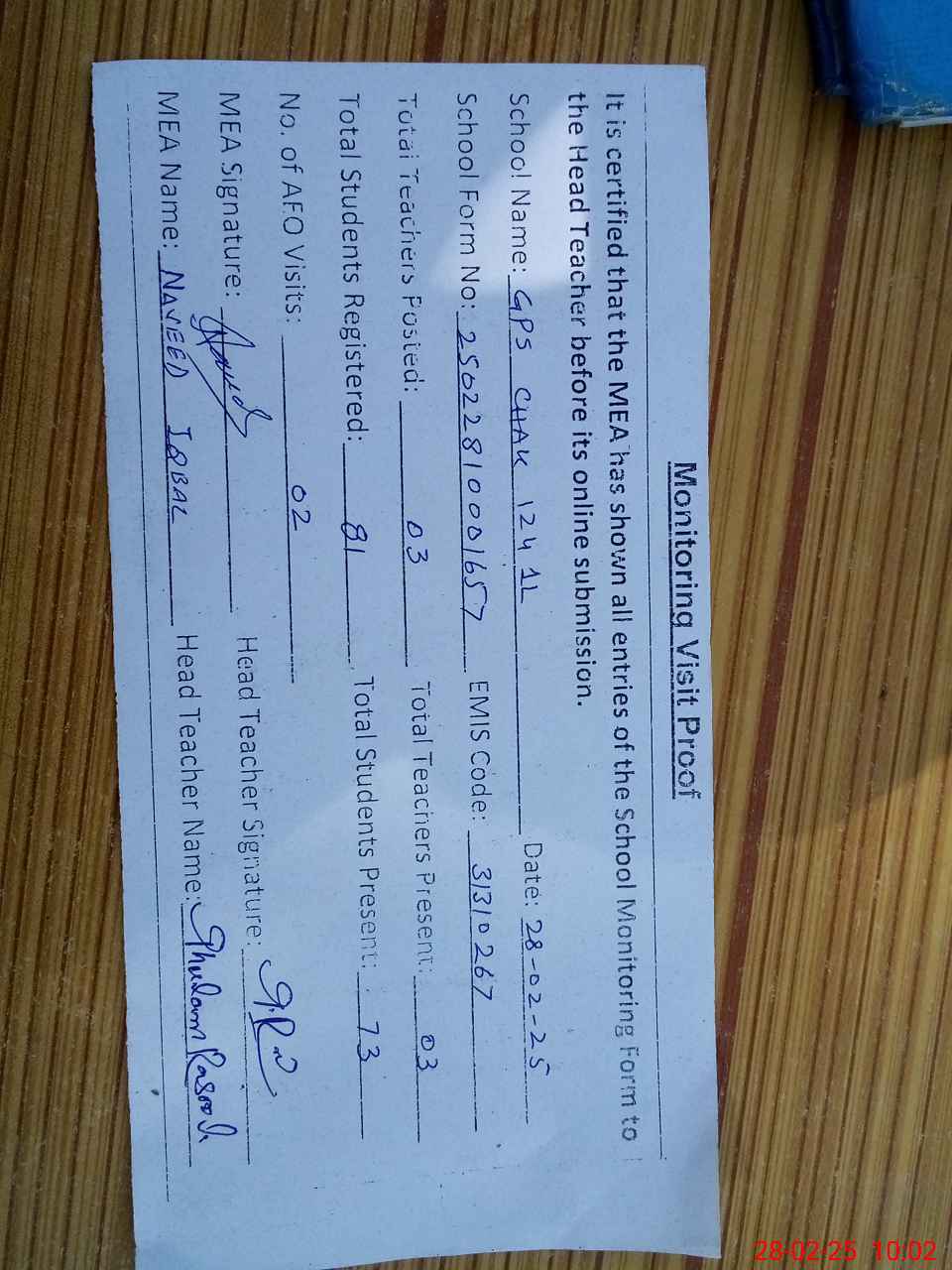 | Attendance Register | Head Teacher | MEA with School | Visit Proof |