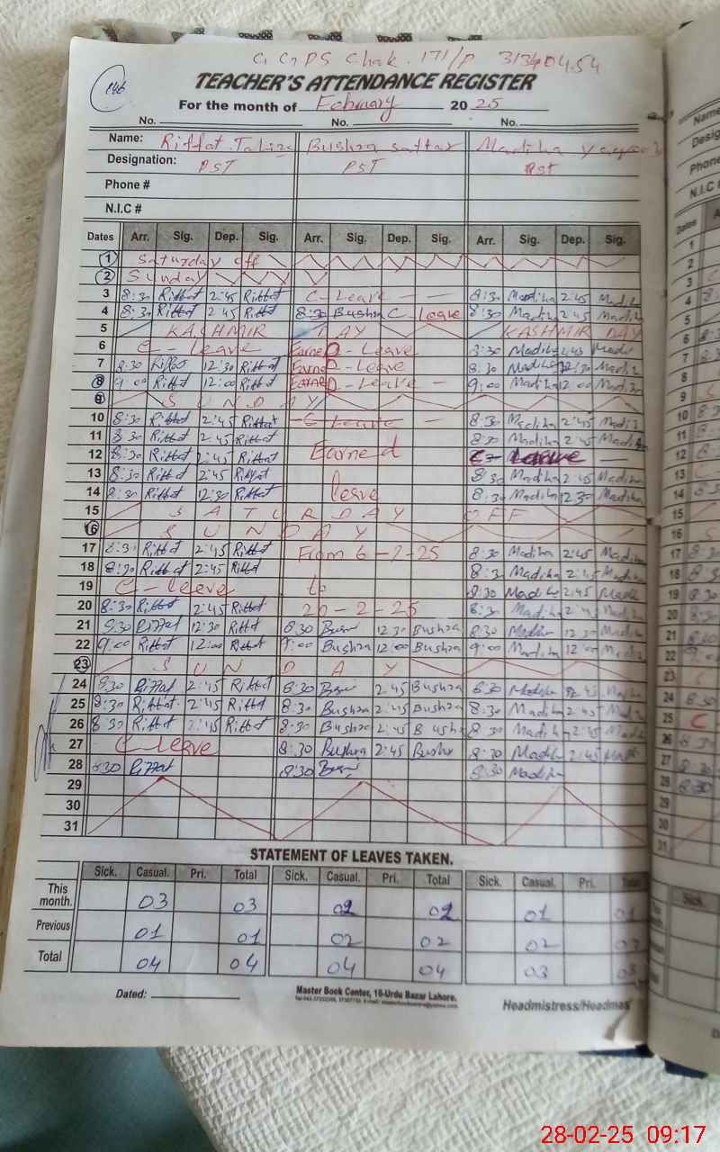 | Name: RI**** TA**** Designation: (School Headmaster's/Headmistress's) PST Phone/Cell Number: 03**** |