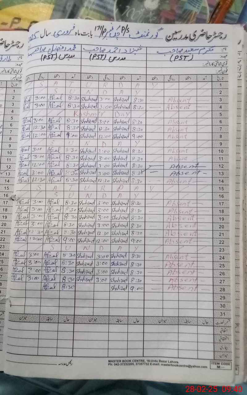 | CNIC | Full Name | Designation | R/C | Absence During Last Calender Month |