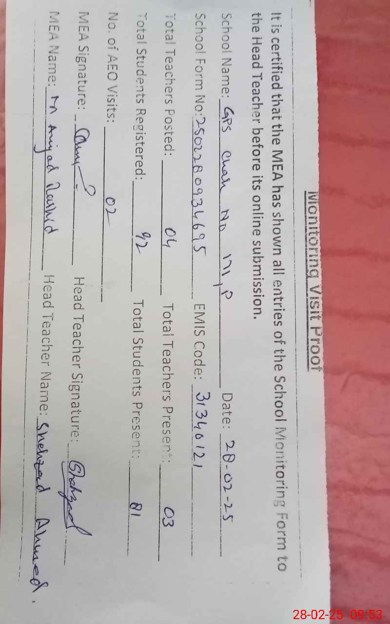 | Attendance Register | Head Teacher | MEA with School | Visit Proof |