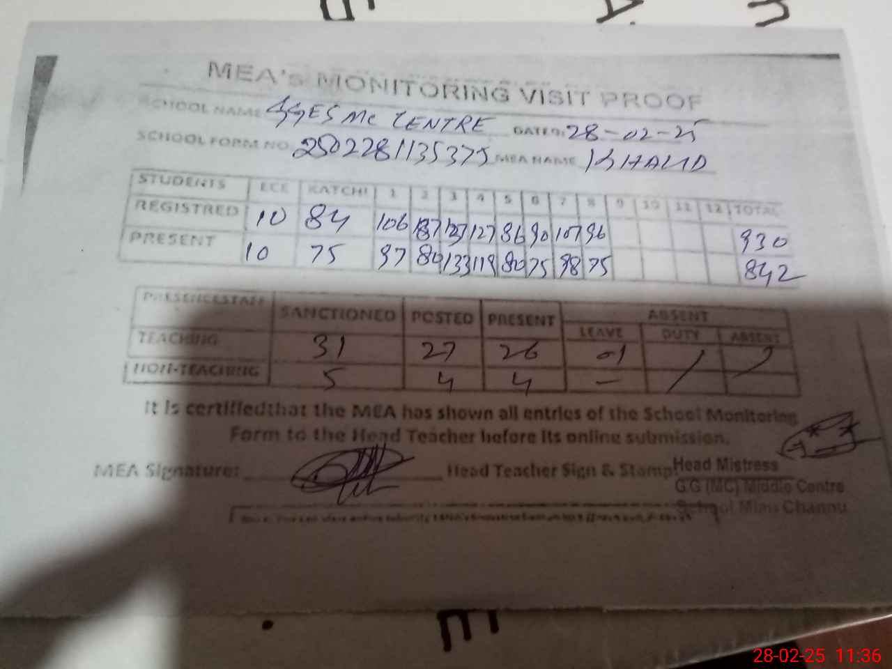 | Attendance Register | Head Teacher | MEA with School | Visit Proof |